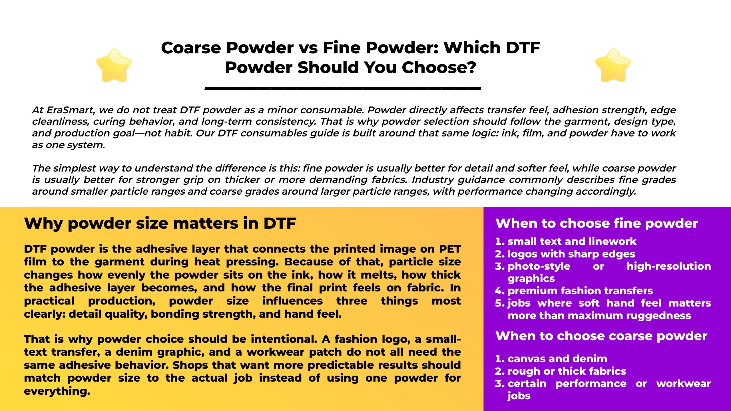 At EraSmart, we do not treat DTF powder as a minor consumable. Powder directly affects transfer feel, adhesion strength, edge cleanliness, curing behavior, and long-term consistency. That is why powder selection should follow the garment, design type, and production goal—not habit. Our DTF consumables guide is built around that same logic: ink, film, and powder have to work as one system.