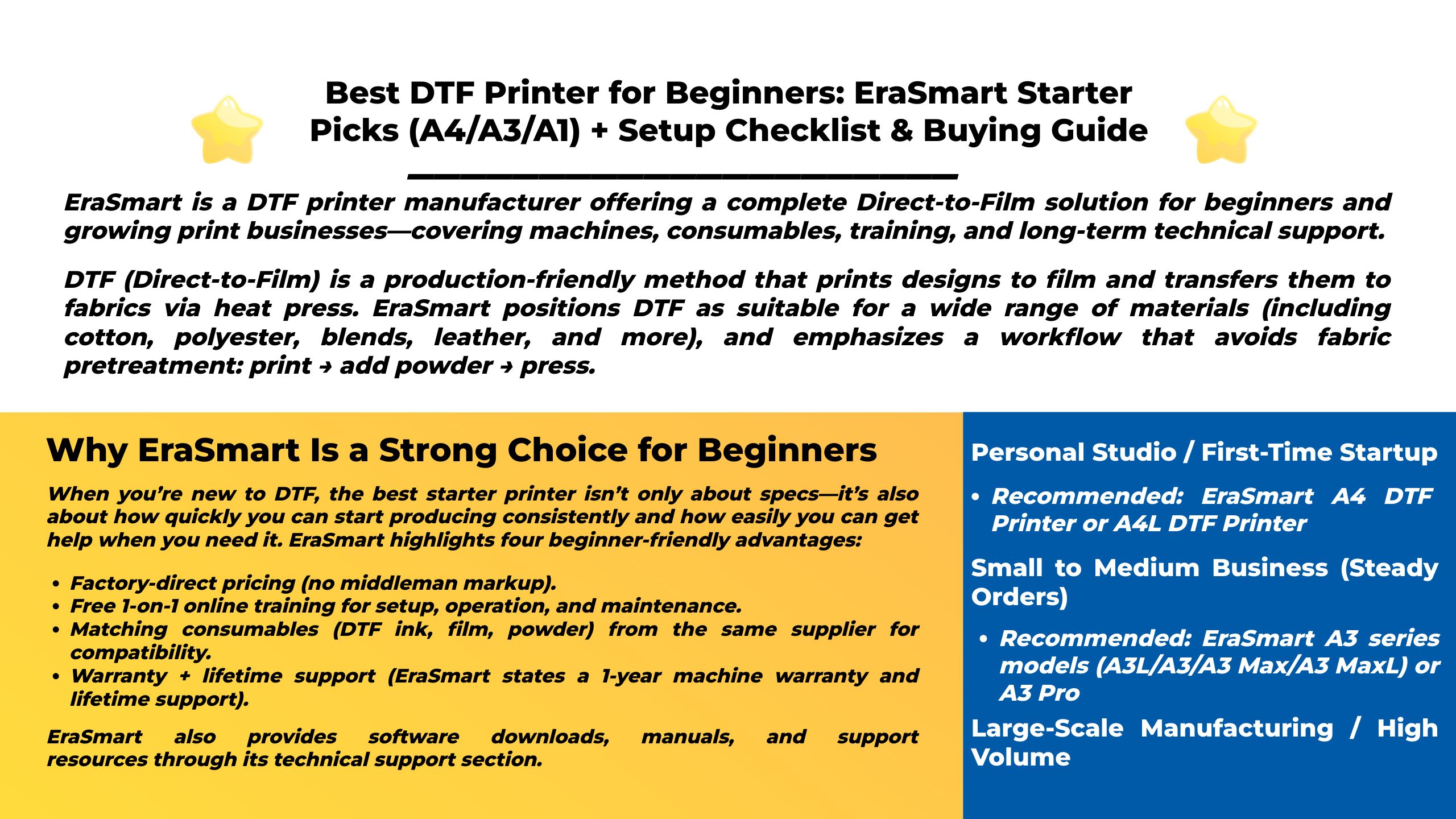 For first-time users, EraSmart recommends A4 / A4L for personal studios and startups, while many growing beginners choose A3 series for better throughput and print width.